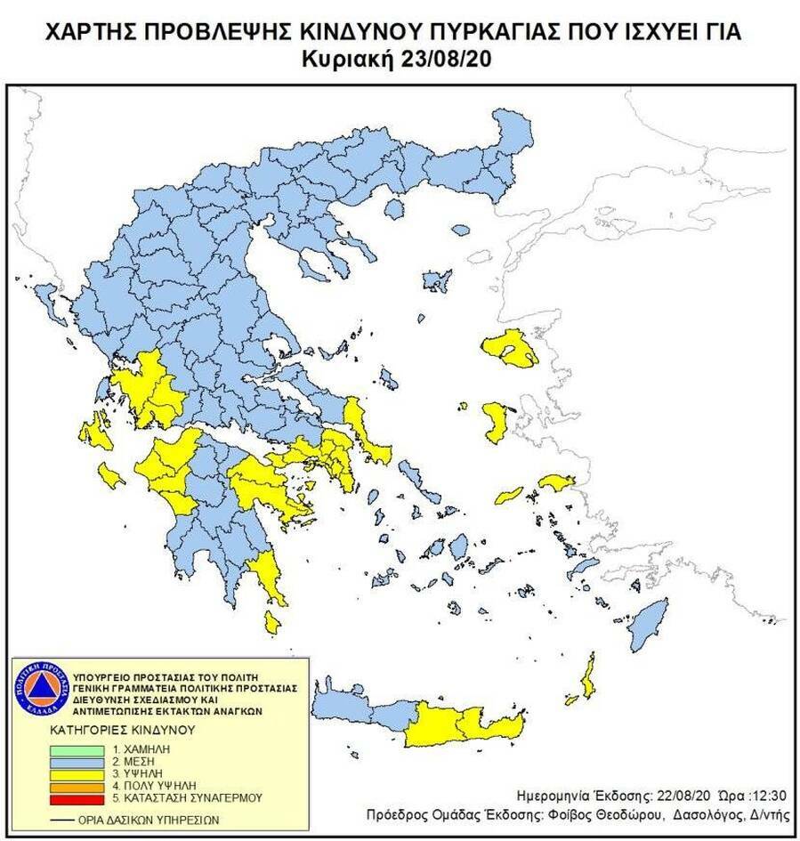 Σύμφωνα με το Χάρτη Πρόβλεψης Κινδύνου Πυρκαγιάς που εκδίδει η Γενική Γραμματεία Πολιτικής Προστασίας του Υπουργείου Προστασίας του Πολίτη, προβλέπεται υψηλός κίνδυνος πυρκαγιάς (κατηγορία κινδύνου 3) σε Αττική, Ν.Εύβοια, Κορινθία, Αργολίδα, Λακωνία, Κύθηρα, Ηλεία, Αχαΐα, Αιτωλοακαρνανία, νησιά Ιονίου, Β.Αιγαίου, Κάρπαθο και Κρήτη.