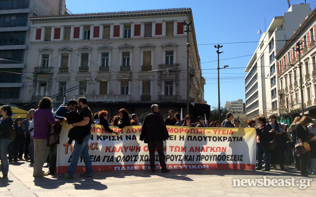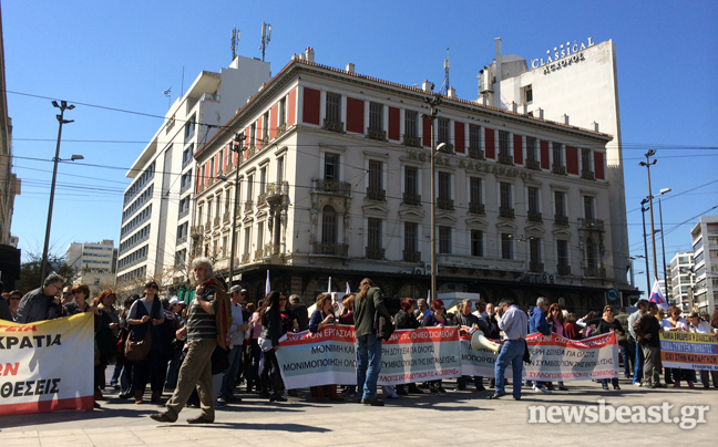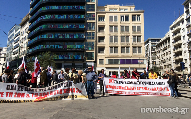 Στην πλατεία Κλαυθμώνος συγκεντρώνονται αυτή την ώρα σχολικοί φύλακες, καθαρίστριες, σωματεία από διάφορους φορείς του Δημοσίου που διαμαρτύρονται για τις απολύσεις στο Δημόσιο.