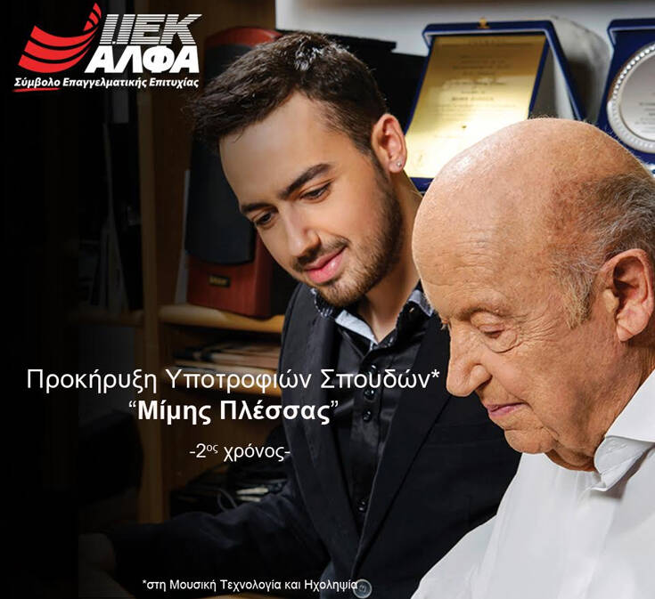 Πρωτοπόρο επί σειρά ετών στην παροχή υποτροφιών σε χιλιάδες νέους της χώρας μας, το ΙΕΚ ΑΛΦΑ προκηρύσσει -για 2η συνεχή χρονιά φέτος- τις «Υποτροφίες Μίμης Πλέσσας», για σπουδές στα νέα τμήματα Μουσικής Τεχνολογίας & Ηχοληψίας 2020-2021. Πρόκειται για έναν θεσμό -που στέφθηκε πέρυσι με απόλυτη επιτυχία- τιμητικά αφιερωμένο στον κορυφαίο δημιουργό, Μίμη Πλέσσα! Ένα όνομα, μια ιστορία, 70 χρόνια δημιουργίας! Μια μουσική παρακαταθήκη που μεγάλωσε 3 γενιές και παραμένει διαχρονική και σύγχρονη έως τις μέρες μας!