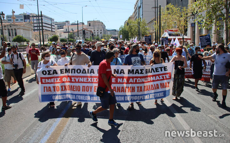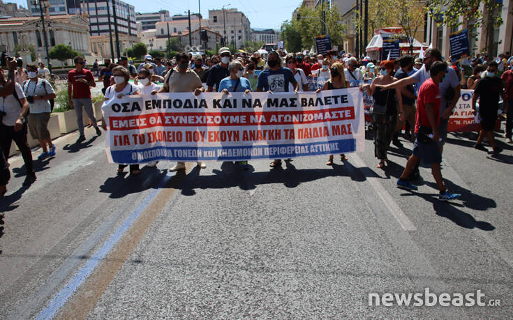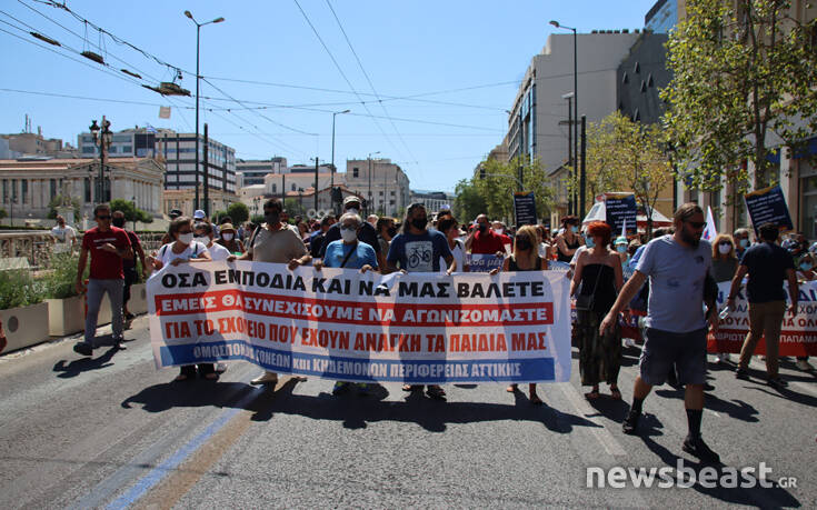 «Όσα εμπόδια και να μας βάλετε εμείς θα συνεχίσουμε να αγωνιζόμαστε για το σχολείο που έχουν ανάγκη τα παιδιά μας» γράφει το πανό της Ομοσπονδίας Γονέων και Κηδεμόνων της Περιφέρειας Αττικής.