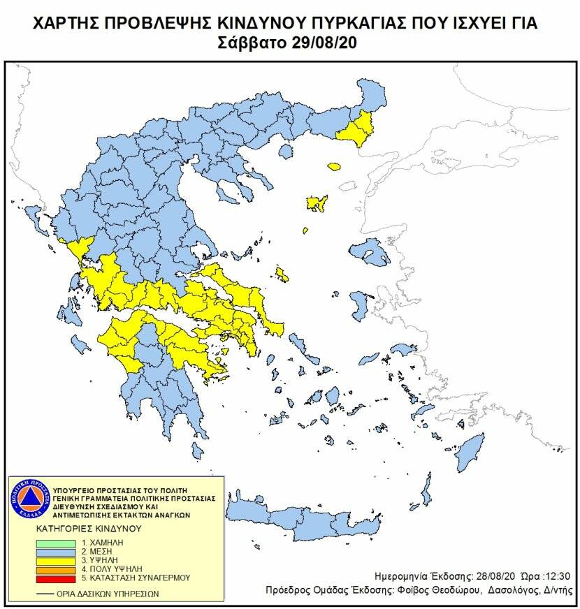 Σύμφωνα με το Χάρτη Πρόβλεψης Κινδύνου Πυρκαγιάς που εκδίδει η Γενική Γραμματεία Πολιτικής Προστασίας του Υπουργείου Προστασίας του Πολίτη, προβλέπεται υψηλός κίνδυνος πυρκαγιάς (κατηγορία κινδύνου 3) σε Αττική, Εύβοια, Σκύρο, Έβρο, Σαμοθράκη, Λήμνο, Φθιώτιδα, Βοιωτία, Φωκίδα, Αιτωλοακαρνανία, Πρέβεζα, Ηλεία, Αχαΐα, Κορινθία & Αργολίδα.