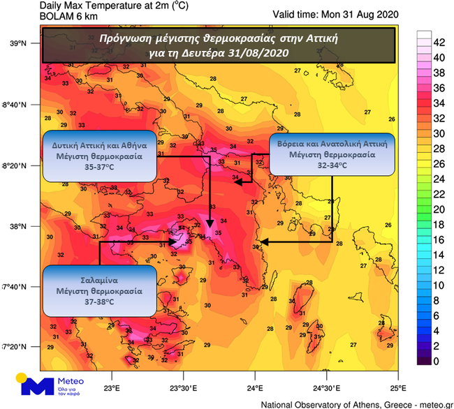 Πολύ υψηλές θερμοκρασίες αναμένονται και στην περιοχή της Αττικής, όπου τις μεσημεριανές ώρες της Δευτέρας 31/08, οι τιμές θα φτάσουν τοπικά τους 37 βαθμούς και στο νησί της Σαλαμίνας τους 38 βαθμούς Κελσίου.