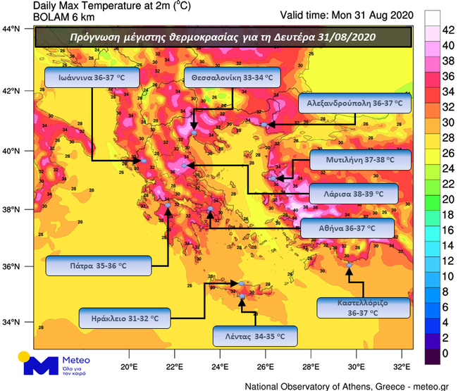 Χάρτης 1. Εκτιμώμενη μέγιστη θερμοκρασία για τη Δευτέρα 31/08/2020, σύμφωνα με το αριθμητικό μοντέλου καιρού του Εθνικού Αστεροσκοπείου Αθηνών / Meteo.gr. Στο χάρτη, επίσης, εμφανίζονται οι μέγιστες θερμοκρασίες σε επιλεγμένες πόλεις.