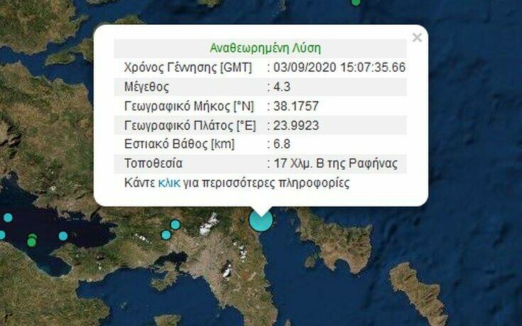 Σύμφωνα με το Γεωδυναμικό Ινστιτούτο ο σεισμός είχε επίκεντρο 17 χλμ βόρεια της Ραφήνας και 6,8 km εστιακό βάθος.