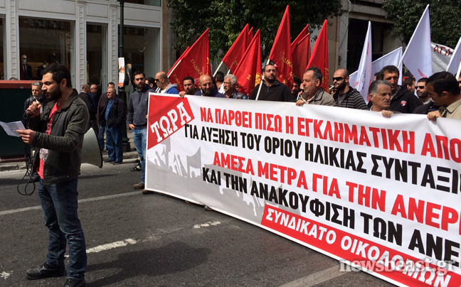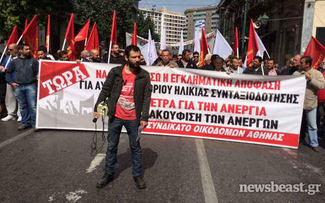 Πορεία διαμαρτυρίας πραγματοποιούν αυτή την ώρα οικοδόμοι με κατεύθυνση το υπουργείο Εργασίας.