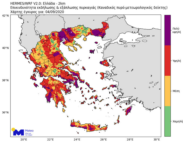 Οι ενισχυμένοι άνεμοι θα έχουν ως αποτέλεσμα τον αυξημένο κίνδυνο εκδήλωσης και εξάπλωσης πυρκαγιάς σε μεγάλο τμήμα της ηπειρωτικής χώρας, αλλά και των νησιών του Αιγαίου και του Ιονίου.