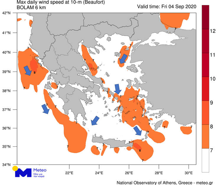 Για σήμερα Παρασκευή 04/09, η ένταση των βορείων ανέμων στα ανατολικά ηπειρωτικά, το Αιγαίο αλλά και στο Ιόνιο θα φτάσει τα 7 μποφόρ και τοπικά στο Βόρειο Ιόνιο τα 8 μποφόρ, όπως εμφανίζεται στο Χάρτη 1.