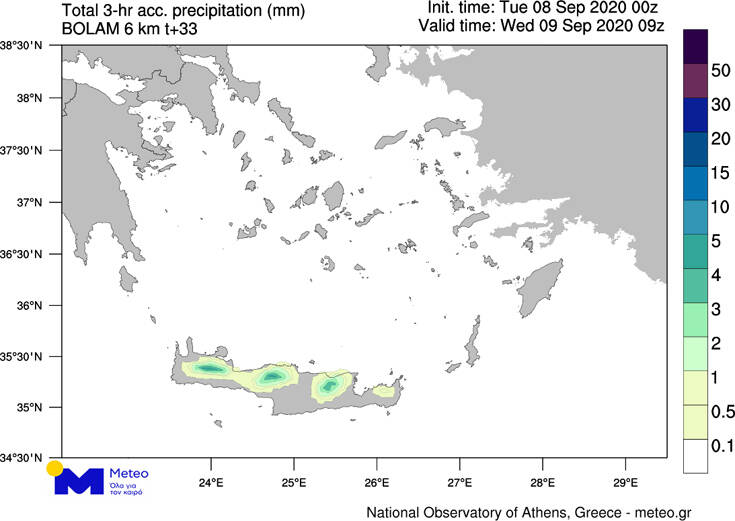 Παράλληλα, αυξημένη είναι η πιθανότητα εκδήλωσης βροχοπτώσεων στην Κρήτη και κυρίως στα βόρεια και ορεινά αυτής την Τετάρτη 09/09, ενώ πιθανότητα τοπικών βροχών υπάρχει και στη Νότια Εύβοια και στις Κυκλάδες. Στο σχετικό χάρτη παρουσιάζεται ενδεικτικά η αναμενόμενη βροχόπτωση το μεσημέρι της Τετάρτης 09/09 στα νοτιοανατολικά διαμερίσματα της χώρας.