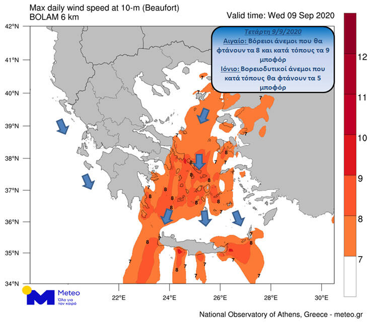 Σύμφωνα με τα τελευταία προγνωστικά δεδομένα του Εθνικού Αστεροσκοπείου Αθηνών/meteo.gr, το μελτέμι θα ενισχυθεί την Τετάρτη 09/09 οπότε θα φτάνει τα 8 και τοπικά τα 9 μποφόρ.