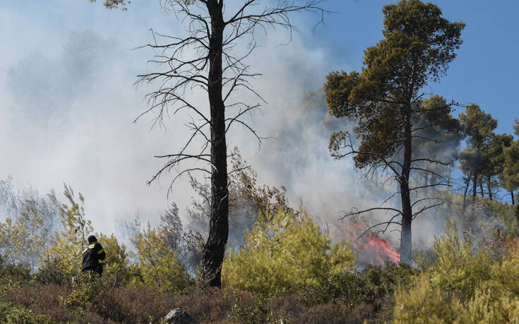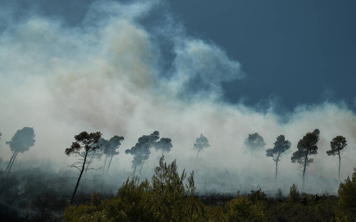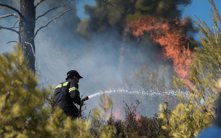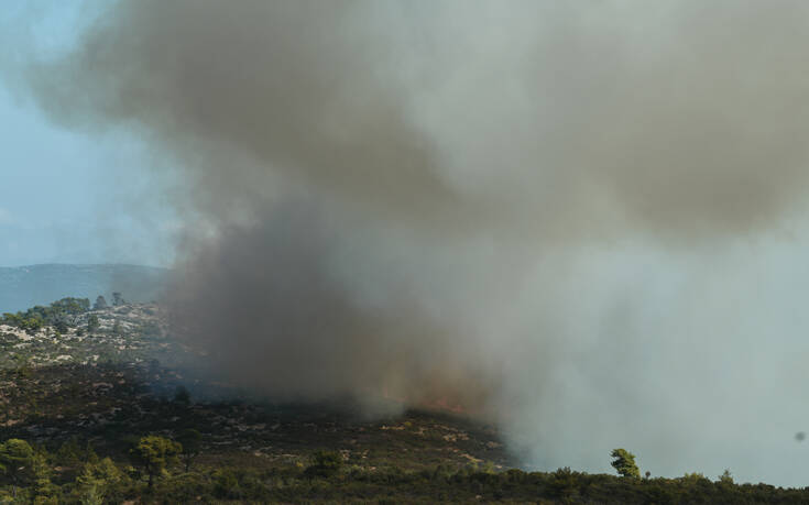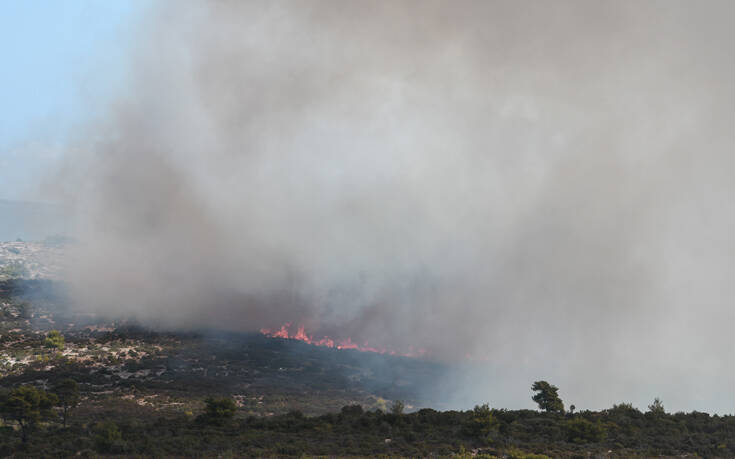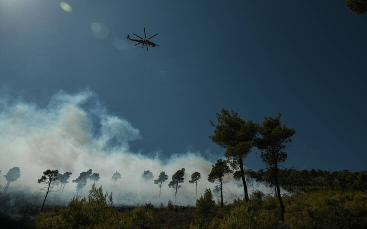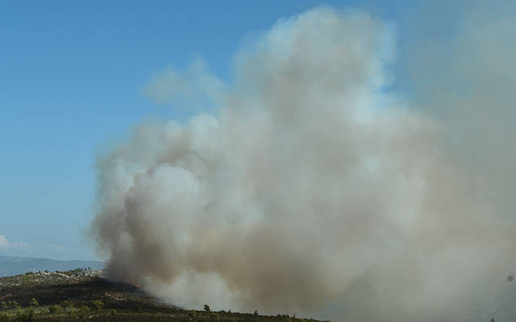 Ισχυρές δυνάμεις της Πυροσβεστικής από στεριά και αέρα προσπαθούν να θέσουν υπό έλεγχο τη μεγάλη φωτιά που έχει ξεσπάσει στη Νέα Μάκρη σε δασική έκταση.
