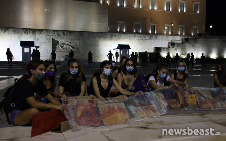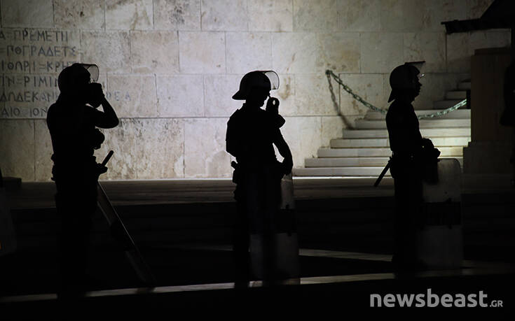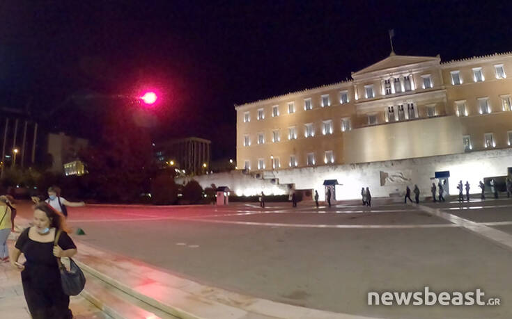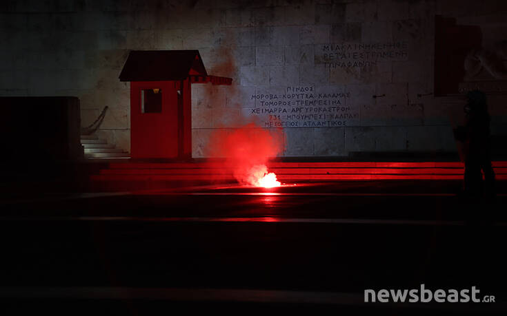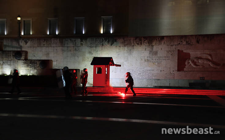 Συγκεκριμένα, όταν οι διαδηλωτές έφτασαν στη Βουλή, μία ομάδα περίπου δέκα νεαρών πέταξαν μία φωτοβολίδα προς την πλευρά των αστυνομικών δυνάμεων, μπροστά από τους Εύζωνες, καθώς και κάποιες πέτρες.