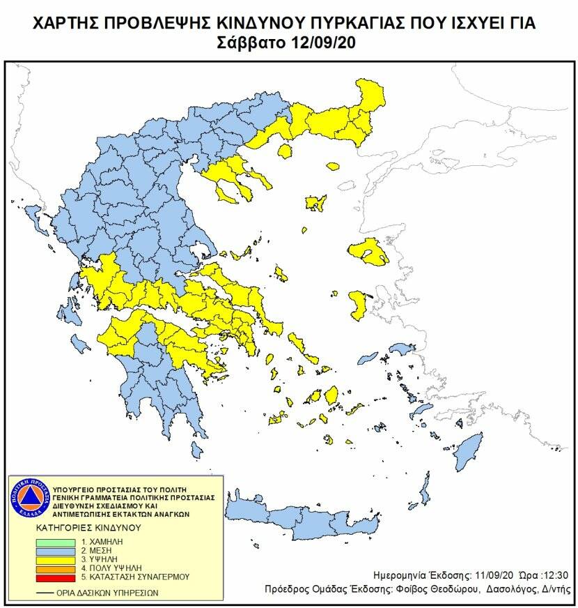 Σύμφωνα με το Χάρτη Πρόβλεψης Κινδύνου Πυρκαγιάς που εκδίδει η Γενική Γραμματεία Πολιτικής Προστασίας του Υπουργείου Προστασίας του Πολίτη, προβλέπεται υψηλός κίνδυνος πυρκαγιάς (κατηγορία κινδύνου 3) σε Αττική, Στερεά Ελλάδα, περιοχές Πελοποννήσου, Χαλκιδική, Αν. Μακεδονία & Θράκη, νησιά Β. Αιγαίου και Κυκλάδες