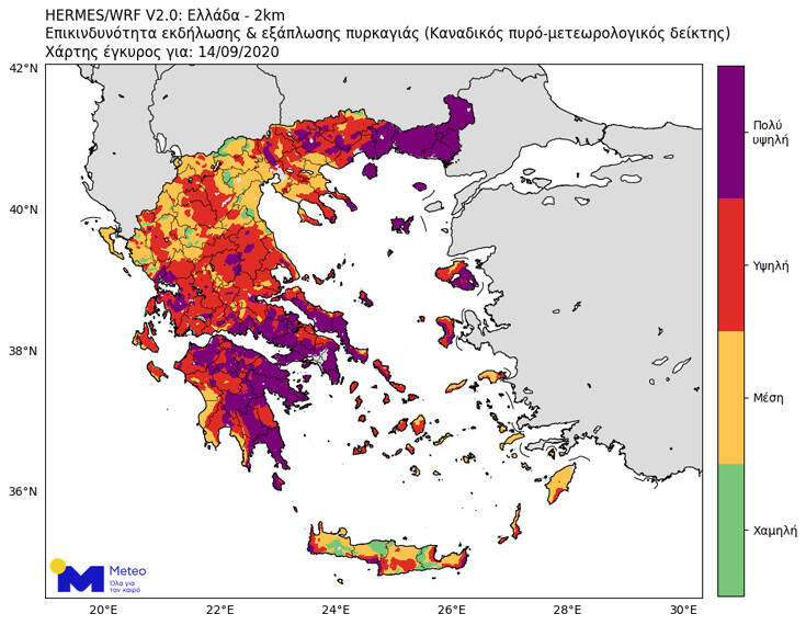 Οι ενισχυμένοι άνεμοι θα έχουν ως αποτέλεσμα τον αυξημένο κίνδυνο εκδήλωσης και εξάπλωσης πυρκαγιάς σε μεγάλο τμήμα της ηπειρωτικής χώρας και των νησιών του Αιγαίου, σύμφωνα με τον καναδικό πυρο-μετεωρολογικό δείκτη, ο οποίος υπολογίζεται από το Εθνικό Αστεροσκοπείο Αθηνών/Meteo.gr και περιλαμβάνεται στις υπηρεσίες και στα προϊόντα που αναπτύχθηκαν στα πλαίσια του ερευνητικού προγράμματος DISARM.