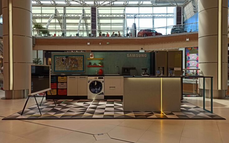 Οι οικιακές συσκευές που βρίσκονται στο booth της Samsung στο The Mall Athens πλαισιώνονται από τις Lifestyle TVs της εταιρείας, The Frame και The Serif.