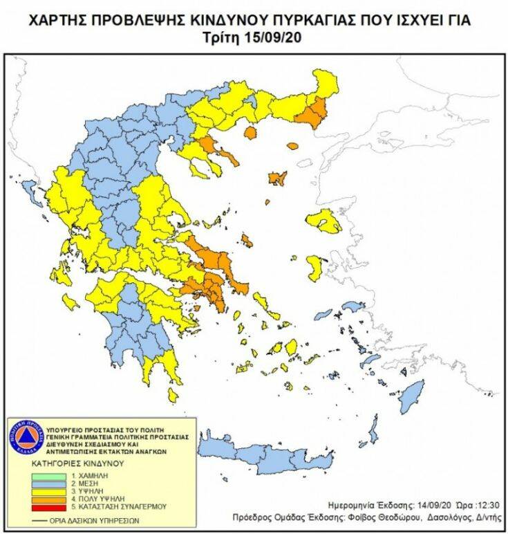 Σύμφωνα με τον Χάρτη Πρόβλεψης Κινδύνου Πυρκαγιάς προβλέπεται πολύ υψηλός κίνδυνος πυρκαγιάς (κατηγορία κινδύνου 4) για τις εξής περιοχές: