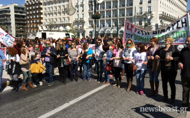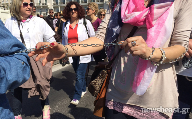 Αλυσοδεμένοι και με τσιρότα στο στόμα διαμαρτυρήθηκαν στην Αμαλίας οι απλήρωτοι εργαζόμενοι του προγράμματος «Βοήθεια στο Σπίτι», οι οποίοι πραγματοποιούν σήμερα και αύριο 48ωρη απεργία.