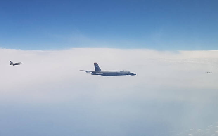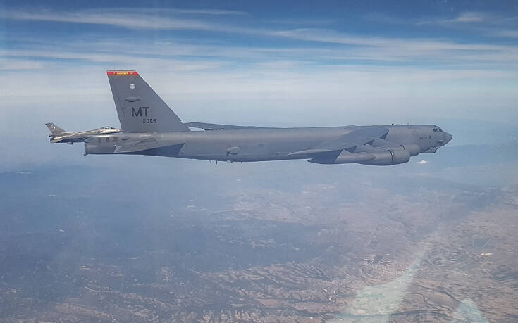 Τέσσερα ζεύγη ελληνικών αεροσκαφών F-16 της Πολεμικής Αεροπορίας συνόδευσαν δύο αμερικανικά στρατηγικά βομβαρδιστικά τύπου B-52.