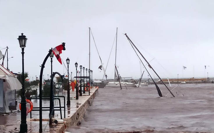 Επίσης στην ίδια περιοχή, σύμφωνα με πληροφορίες από τον δήμο, οι ισχυροί άνεμοι, που κατά την διάρκεια της νύχτας έφθασαν τα 11 μποφόρ, έβγαλαν τρία ιστιοφόρα στη στεριά και μέσα στο λιμάνι έχουν βυθιστεί τουλάχιστον άλλα τέσσερα.