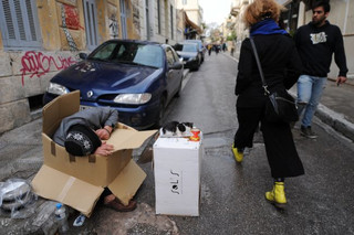 Η εικόνα ενός, από τους πολλούς αστέγους της πόλης μας σε δρόμο της Πλάκας, θα έλεγε κανείς ότι δεν φέρνει τίποτα καινούργιο στην ήδη εξαθλιωμένη εικόνα της Αθήνας. Η προσπάθειά του όμως, να χωρέσει σε ένα αυτοσχέδιο «σπίτι», που αυτή τη φορά δεν είναι άλλο από ένα χαρτόκουτο, θα έπρεπε να θλίβει και να σοκάρει και τους πιο σκληρούς από εμάς.