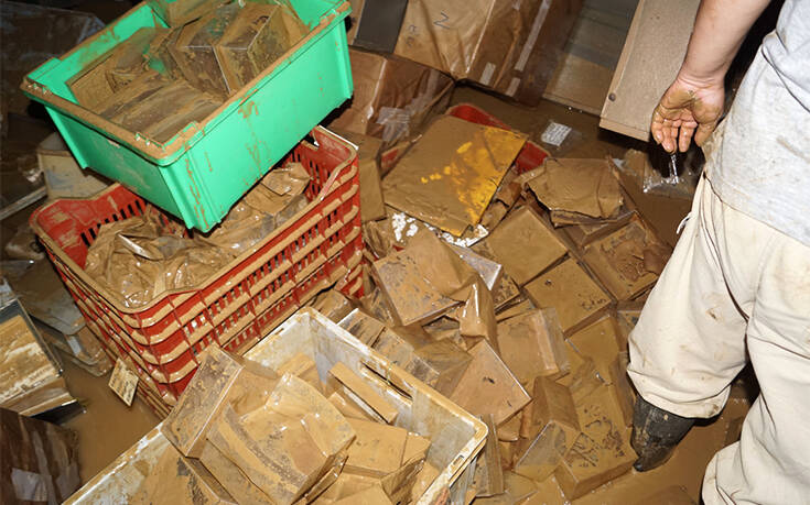 - β) Το σύνολο των κιβωτίων με τα αρχαία αντικείμενα που ήταν τακτοποιημένα στα ειδικά ερμάρια γέμισαν με νερό και λάσπη.