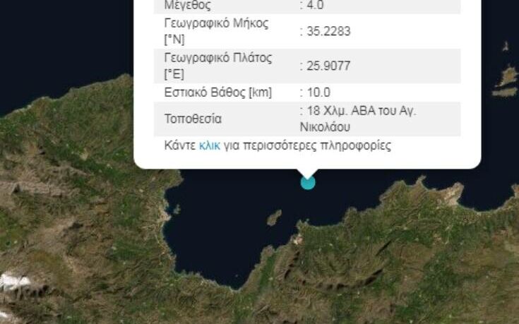 Σεισμός τώρα στην Κρήτη. Σύμφωνα με το Γεωδυναμικό Ινστιτούτο είχε μέγεθος 4 Ρίχτερ. Το επίκεντρο του σεισμού, σύμφωνα με το Γεωδυναμικό, εντοπίζεται 18 χλμ. Ανατολικά, βορειανατολικά του Αγίου Νικολάου και είχε εστιακό βάθος 10 χλμ.