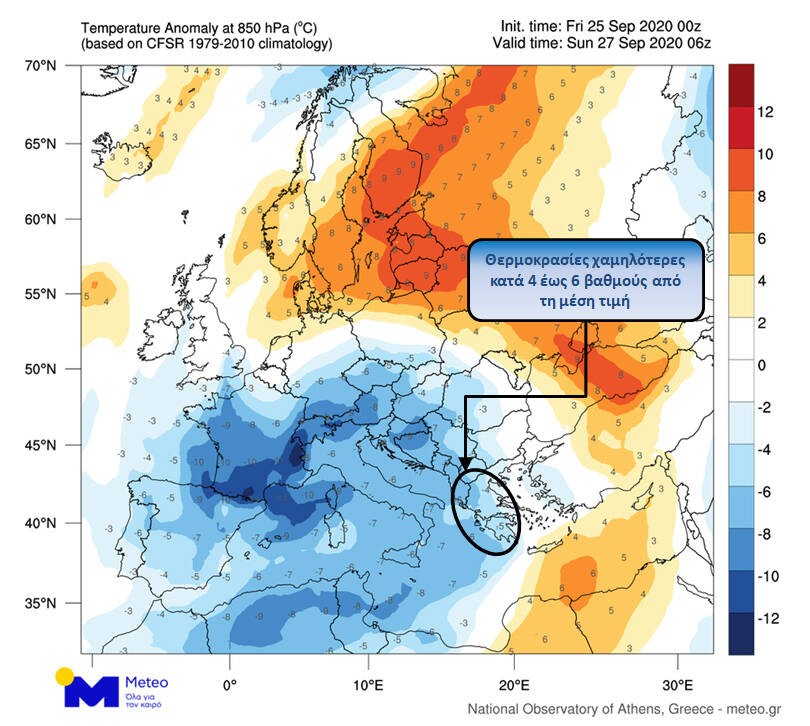 Στον χάρτη που ακολουθεί, σύμφωνα με τα στοιχεία του meteo.gr, παρουσιάζεται η απόκλιση της θερμοκρασίας σε ύψος 1500 μέτρων πάνω από το έδαφος σε σχέση με την μέση τιμή των ετών 1979 – 2010, για το πρωί της Κυριακής. Με κόκκινες αποχρώσεις φαίνονται οι υψηλότερες από τη μέση τιμή θερμοκρασίες ενώ με γαλάζιες οι χαμηλότερες. Όπως προκύπτει από αυτόν, οι θερμοκρασίες που αναμένονται στα ηπειρωτικά και στο Ιόνιο θα είναι 4 έως 6 βαθμούς χαμηλότερες από τη μέση τιμή.