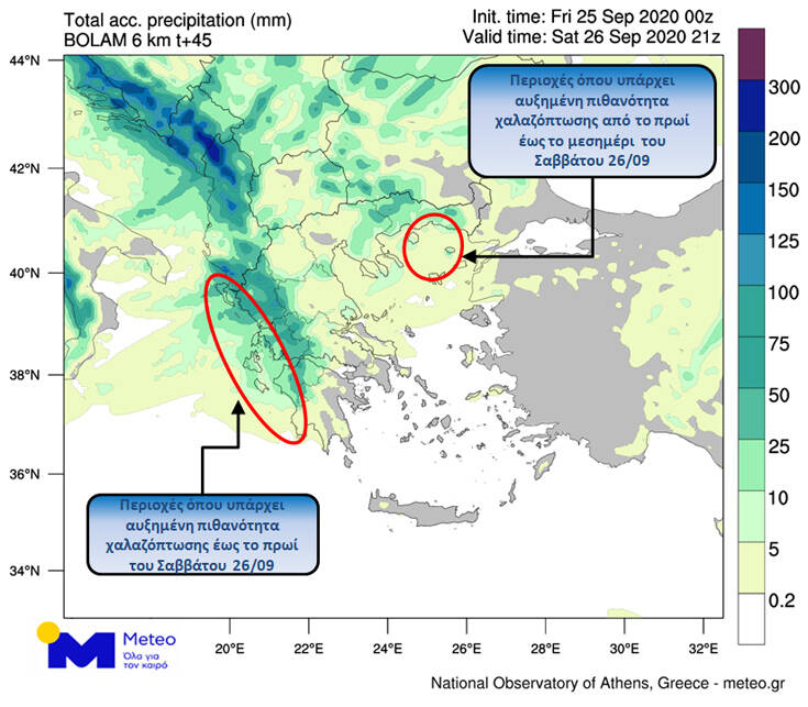 Παράλληλα, βροχές και καταιγίδες που κατά τόπους θα είναι ισχυρές αναμένονται από αργά το βράδυ της Παρασκευής 25/09. Τα φαινόμενα θα ξεκινήσουν από το Ιόνιο και τα δυτικά ηπειρωτικά και κατά διάρκεια του Σαββάτου 26/09 θα επεκταθούν στα υπόλοιπα ηπειρωτικά και στο Βόρειο Αιγαίο. Πιθανότητα χαλαζόπτωσης υπάρχει έως το πρωί του Σαββάτου 26/09 στο Ιόνιο και στα δυτικά ηπειρωτικά και από το πρωί έως το μεσημέρι της ίδιας ημέρας στη Θράκη και στο Βόρειο Αιγαίο. Στο χάρτη που ακολουθεί φαίνεται ο ολικός υετός που αναμένεται έως το βράδυ του Σαββάτου 26/09. Τη Κυριακή 27/09 φαινόμενα μικρότερης ισχύος αναμένονται κατά κύριο λόγο στο Ιόνιο, στα δυτικά ηπειρωτικά και στα Δωδεκάνησα.