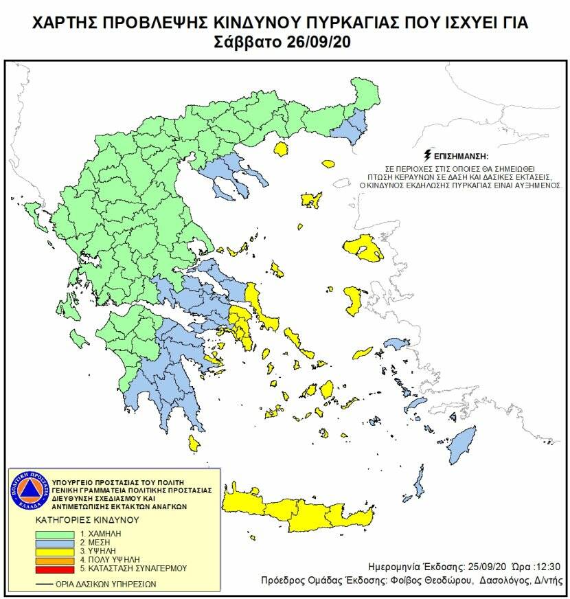 Σύμφωνα με το Χάρτη Πρόβλεψης Κινδύνου Πυρκαγιάς που εκδίδει η Γενική Γραμματεία Πολιτικής Προστασίας του Υπουργείου Προστασίας του Πολίτη, προβλέπεται υψηλός κίνδυνος πυρκαγιάς (κατηγορία κινδύνου 3) σε Έβρο, Καβάλα, Χαλκιδική, Άγιο Όρος, Θάσο, Λήμνο, Σαμοθράκη και Λέσβο.