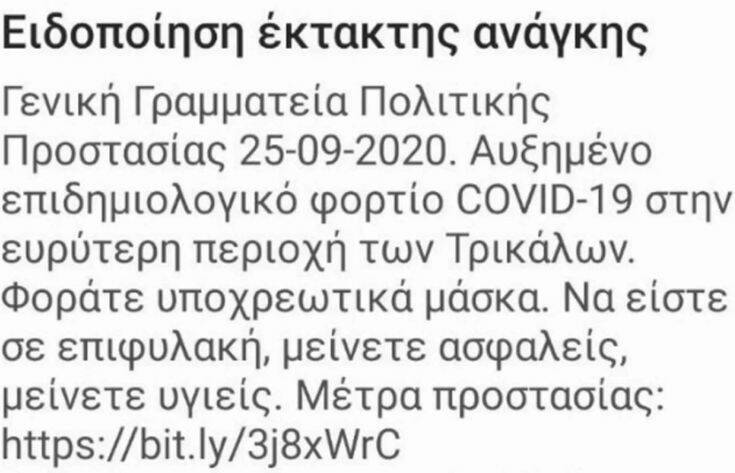 «Γενική Γραμματεία Πολιτικής Προστασίας 25-09-2020. Αυξημένο επιδημιολογικό φορτίο COVID-19 στην ευρύτερη περιοχή των Τρικάλων. Φοράτε υποχρεωτικά μάσκα. Να είστε σε επιφυλακή, μείνετε ασφαλείς, μείνετε υγιείς».