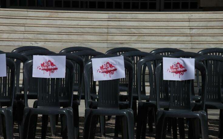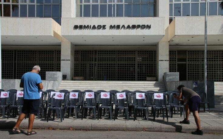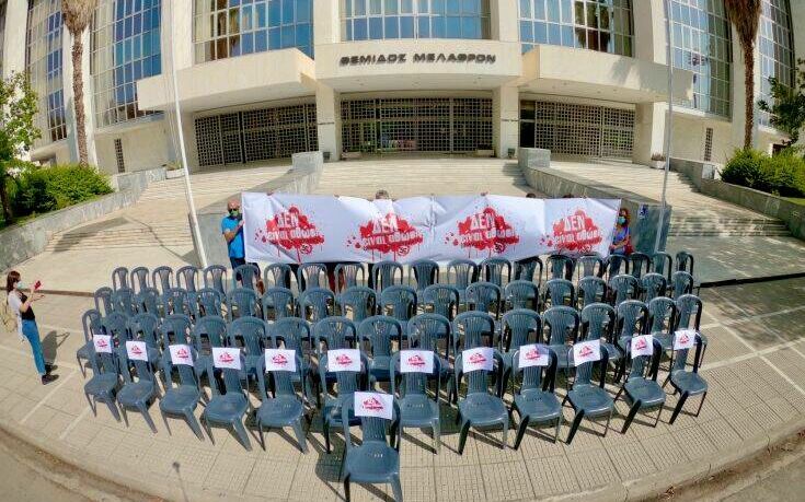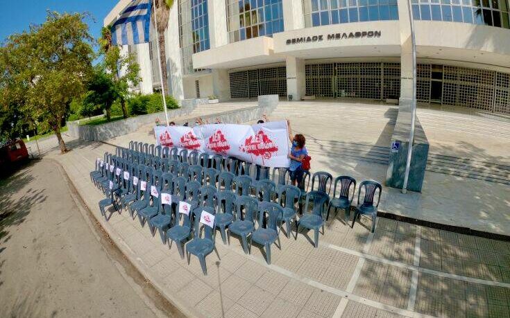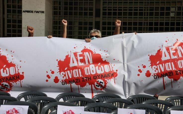 Τα άτομα που έδωσαν το παρών, φορώντας μάσκες για τον κορονοϊό, έφτιαξαν μία αναπαράσταση της δικαστικής αίθουσας με 68 καρέκλες (σ.σ. όσοι και οι κατηγορούμενοι για τη δολοφονία του Παύλου Φύσσα), με πανό και πλακάτ.