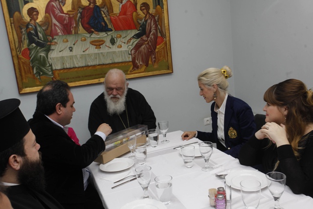 Μετέπειτα παρετέθη γεύμα προς τιμήν του Αρχιεπισκόπου Ιερωνύμου και στη συνέχεια η υπεύθυνη Κατερίνα Ευθυμιοπούλου του προσέφερε ένα αναμνηστικό δώρο.