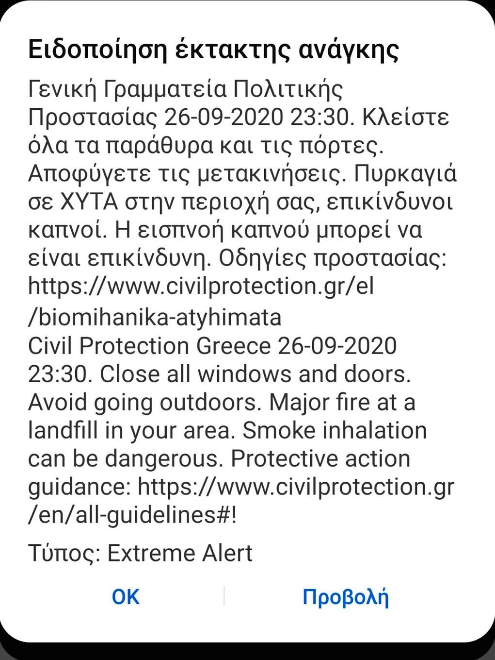 «Κλείστε όλα τα παράθυρα και τις πόρτες. Αποφύγετε τις μετακινήσεις. Πυρκαγιά σε ΧΥΤΑ στην περιοχή σας, επικίνδυνοι καπνοί. Η εισπνοή καπνού μπορεί να είναι επικίνδυνη».