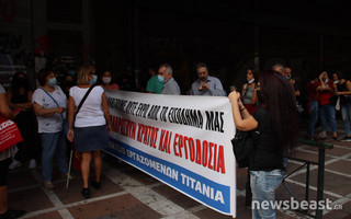 «Όχι στη σύγχρονη σκλαβιά» γράφει το πανό έξω από το υπουργείο.