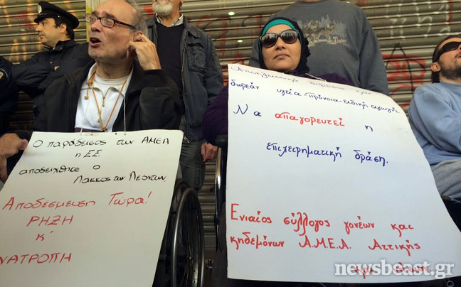 Οι συγκεντρωμένοι διαμαρτύρονται για τις περικοπές επιδομάτων, για το σύστημα υγείας και ζητούν άμεση καταβολή των δεδουλευμένων του προγράμματος «Βοήθεια στο Σπίτι» που τους φροντίζει.