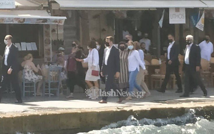 Οι δυο κυρίες μαζί και με την υπουργό Πολιτισμού Λίνα Μενδώνη έκαναν βόλτα κατά μήκος του λιμενοβραχίονα απολαμβάνοντας τη θέα και τον καλό καιρό.