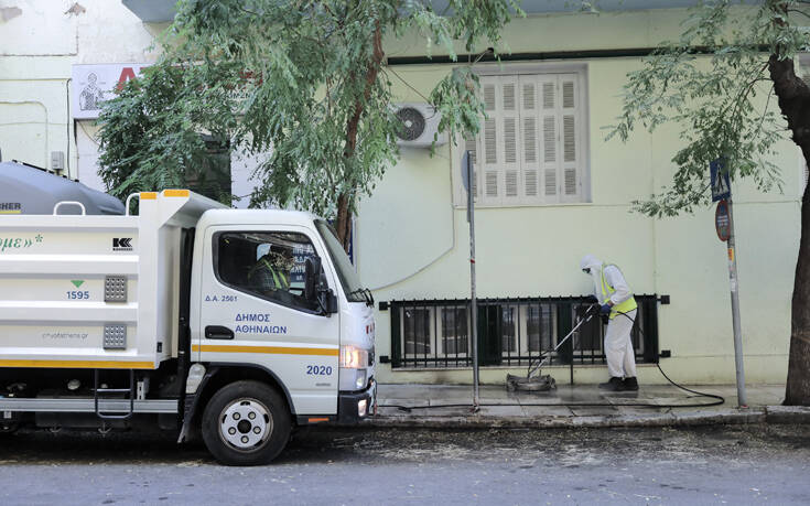 Συνεργεία του δήμου Αθηναίων πλένουν και απολυμαίνουν το οικοδομικό τετράγωνο που βρίσκεται η μονάδα φροντίδας, εφαρμόζοντας τα σχετικά πρωτόκολλα.