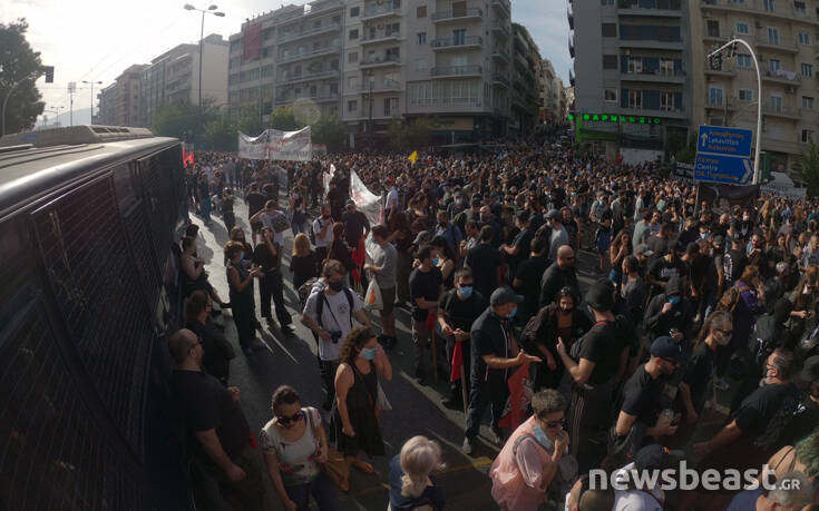 «Δεν είναι αθώοι, οι ναζί στη φυλακή», είναι μερικά από τα συνθήματα που αναγράφονται στα πανό, ενώ από τα ηχεία ακούγονται τραγούδια με αντιφασιστικό περιεχόμενο.