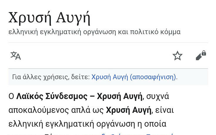 Η Χρυσή Αυγή θεωρείται με απόφαση δικαστηρίου εγκληματική οργάνωση με κάποιον πολίτη να αλλάζει τον ορισμό της και στη Wikipedia. Δίπλα λοιπόν στον ορισμό της λέξης «Χρυσή Αυγή», η Wikipedia πρόσθεσε τη φράση «εγκληματική οργάνωση».