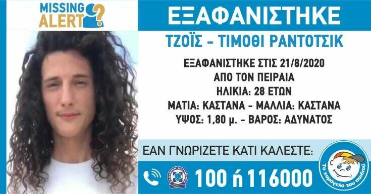 Ο αγνοούμενος μιλά άπταιστα αγγλικά και γερμανικά. Σύμφωνα με το «Missing ALERT» εξαφανίστηκε στις 21 Αυγούστου από τον Πειραιά, έχει καστανά μάτια και μακριά μαλλιά, ύψος 1,80 μ. και είναι αδύνατος.