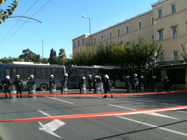 Μάλιστα, δυνάμεις των ΜΑΤ έχουν αποκλείσει τη Βασ. Σοφίας και επιτηρούν διακριτικά τους διαδηλωτές.