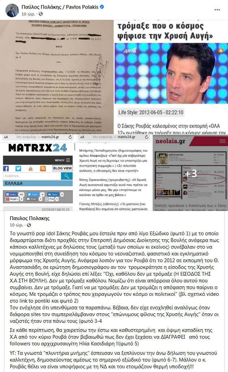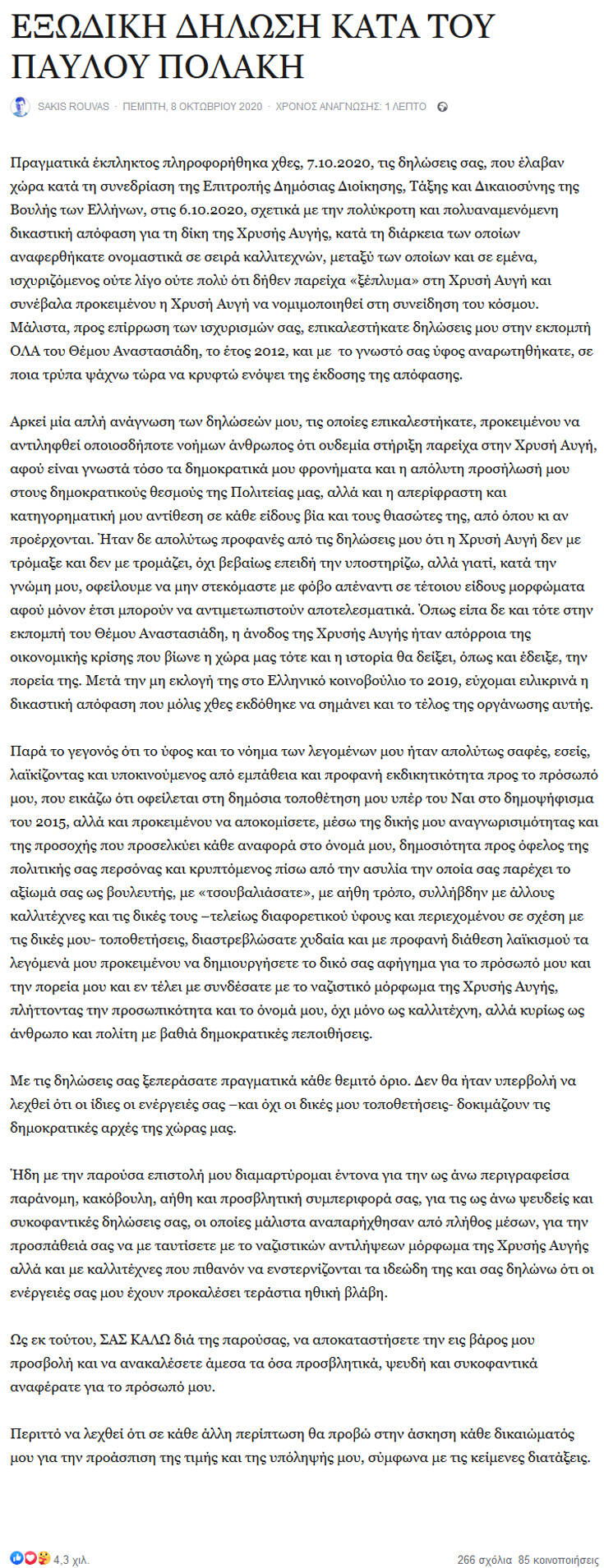 «Τον ενόχλησε ότι υπενθύμισα τα παραπάνω. Βέβαια, δεν είχε ενοχληθεί αναλόγως όταν διάφορα sites τον συμπεριελάμβαναν στους “επώνυμους φίλους της Χρυσής Αυγής” όταν οι ναζιστές ήταν στα πάνω τους» έγραψε μεταξύ άλλων.