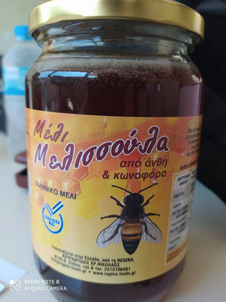 (β) Μέλι από άνθη και κωνοφόρα, εμπορικής ονομασίας «Μελισσούλα», καθαρού βάρους 900g, με αριθμό παρτίδας LΟΤ 1121720 και ημερομηνία λήξης 20/04/23. Το ανωτέρω προϊόν συσκευάζεται από την επιχείρηση «REGINA, ΚΟΥΡΑΝΤΙΔΗΣ ΧΡ. ΝΙΚΟΛΑΟΣ», ενώ ελήφθη από το υποκατάστημα της επιχείρησης «ΕΛΛΗΝΙΚΕΣ ΥΠΕΡΑΓΟΡΕΣ ΣΚΛΑΒΕΝΙΤΗΣ Α.Ε.Ε.», Ευριπίδου 69 & Αιγέως 31-35 & Ασκληπιού, Καλλιθέα.