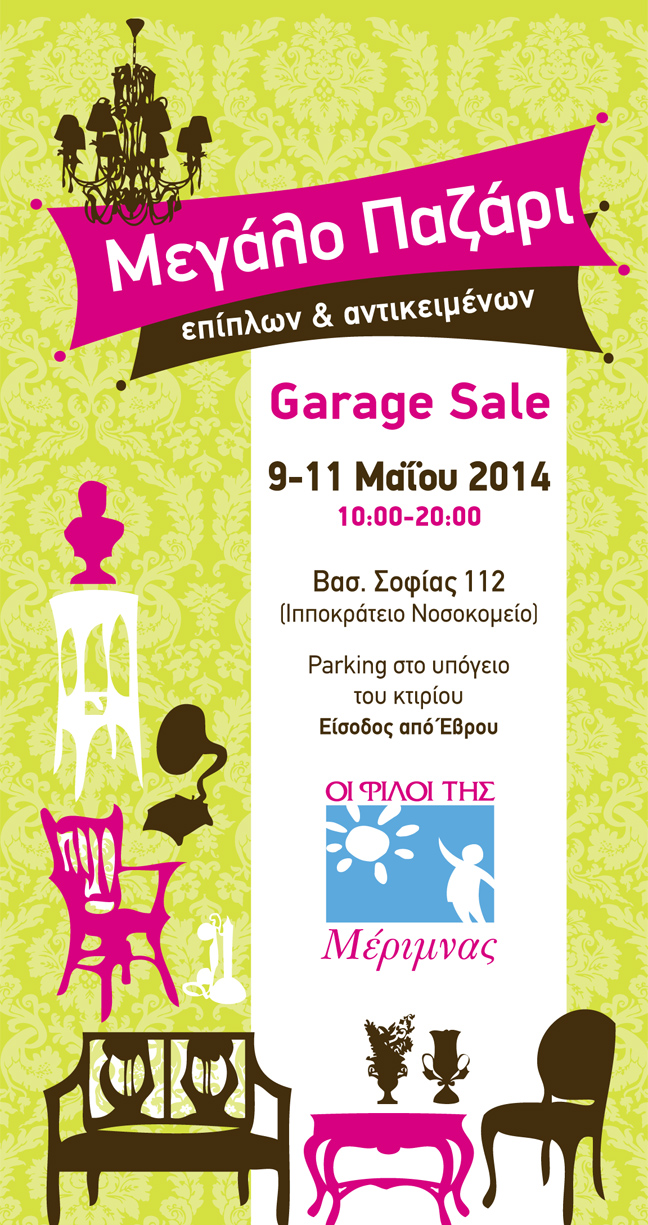 Οι «Φίλοι της Μέριμνας» οργανώνουν το 5ο Mεγάλο Παζάρι-Garage Sale επίπλων και αντικειμένων που θα γίνει στην οδό Βασ. Σοφίας 112, το τριήμερο 9 – 11 Μαΐου, 10.00-20.00.