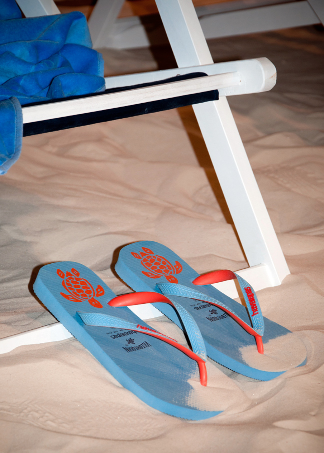 Η συλλογή επίσης διαθέτει εντυπωσιακές πετσέτες θαλάσσης, αλλά και τις μοναδικές σαγιονάρες που σχεδίασε αποκλειστικά η Havaianas για λογαριασμό της Vilebrequin.