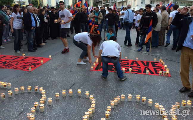 Οι συγκεντρωμένοι έχουν ανάψει κεριά, διαμαρτυρόμενοι για την άρνηση της γενοκτονίας από από τους Τούρκους.