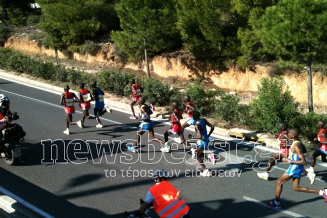 Το γκρουπ των αθλητών, στην πλειοψηφία τους Κενυάτες δρομείς, που οδηγούν την κούρσα της διαδρομής του κλασικού Μαραθωνίου και θέλουν να κόψουν πρώτοι το νήμα…