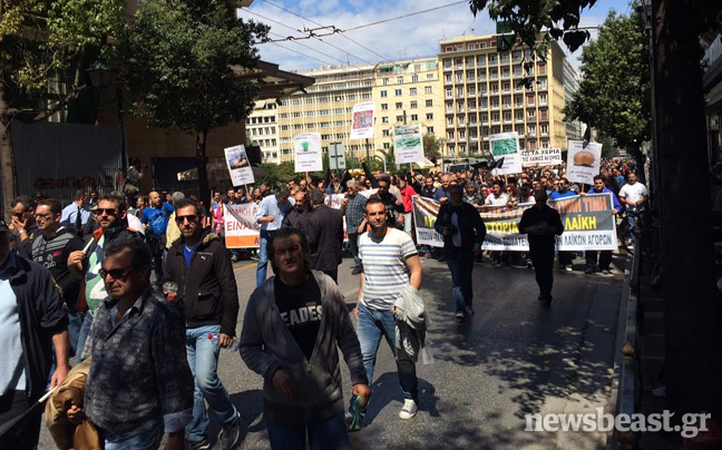 Μεγάλη είναι η συμμετοχή των παραγωγών και των πωλητών στις λαϊκές αγορές στη σημερινή κινητοποίηση στο κέντρο της Αθήνας. Οι διαδηλωτές συγκεντρώθηκαν νωρίς τη Δευτέρα στην πλατεία Κάνιγγος και αυτή την ώρα πραγματοποιούν πορεία προς τη Βουλή.