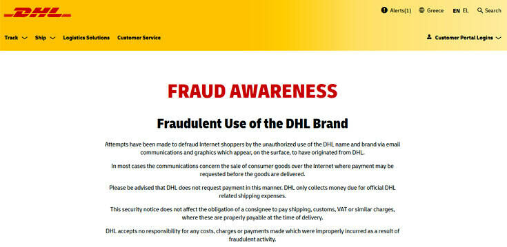 Επισημαίνει πως έγιναν απόπειρες εξαπάτησης με τη μη εξουσιοδοτημένη χρήση του ονόματος, του λογοτύπου και των εμπορικών σημάτων της DHL. Στις περισσότερες περιπτώσεις, αναφέρει η εταιρεία, πρόκειται για επικοινωνία που αφορά σε πώληση καταναλωτικών αγαθών μέσω του διαδικτύου όπου μπορεί να ζητηθεί πληρωμή πριν από την παράδοση των αγαθών.