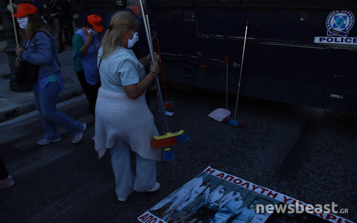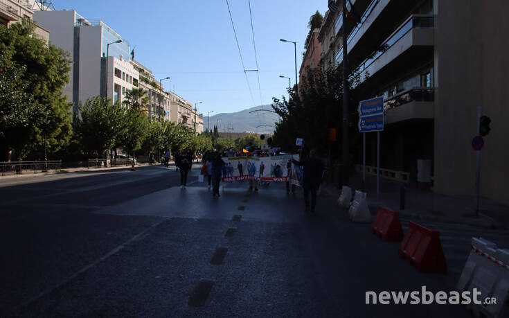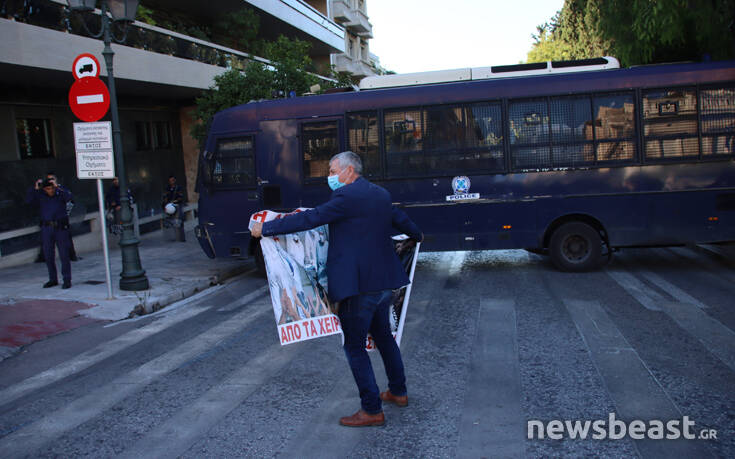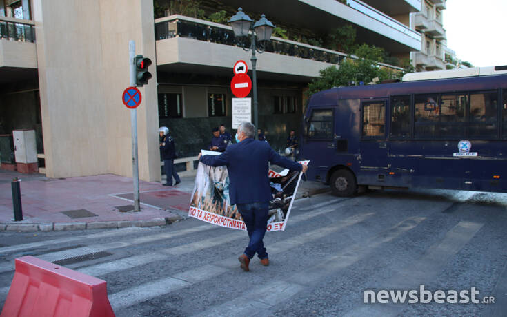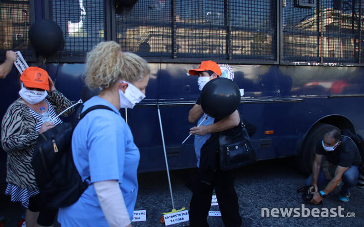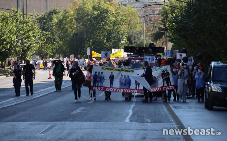 Στην κορυφή της πορείας που πέρασε κοντά από το Μέγαρο Μαξίμου και πρόκειται να καταλήξει στο υπουργείο Υγείας, είναι ο πρόεδρος της ΠΟΕΔΗΝ, Μιχάλης Γιαννάκος. Αυτό που ξεχώρισε, είναι ένα πανό που κρατούσαν στα χέρια τους οι συμμετέχοντες στο συλλαλητήριο και γράφει: «Η απόλυτη υποκρισία – Από τα χειροκροτήματα… στο ξύλο», στο οποίο από τη μια πλευρά εμφανίζει γιατρούς να χειροκροτούνται την ώρα που δίνουν «μάχη» με τον κορονοϊό και από την άλλη καταστολή από αστυνομικές δυνάμεις, κατά τη διάρκεια κινητοποίησής τους.