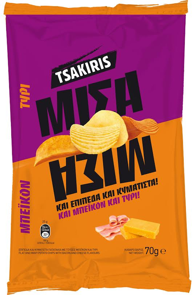 Tσακίρης ΜΙΣΑ-ΜΙΣΑ Μπέικον & Τυρί: Υπέροχα, τραγανά chips με γεύση καπνιστού μπέικον και απολαυστικού τυριού cheddar, ενός αγαπημένου συνδυασμού που αποτελεί μια υπέροχη γευστική πρόταση για πατατάκια. Τα νέα Τσακίρης ΜΙΣΑ-ΜΙΣΑ Mπέικον και Τυρί, θα γίνουν η νέα γευστική…εμμονή!